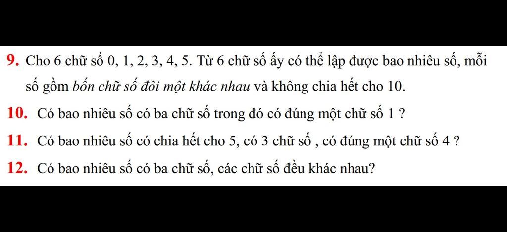 9. Cho 6 chữ số 0, 1, 2, 3, 4, 5. Từ 6 chữ số ấy có thể lập được bao nhiêu số, mỗi