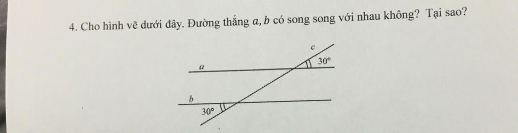 Đường thẳng `a` và đường thẳng `b` song song với nhau vì chúng tạo với đường thẳng `c` hai góc so le ngoài bằng nhau cùng bằng `30^@`