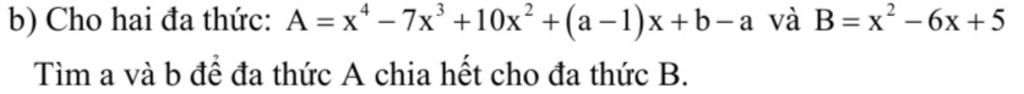 $\to \begin{cases}1^4-7\cdot 1^3+10\cdot 1^2+(a-1)\cdot 1+b-a=0\\ 5^4-7\cdot5^3+10\cdot 5^2+(a-1)\cdot5+b-a=0 \end{cases}$