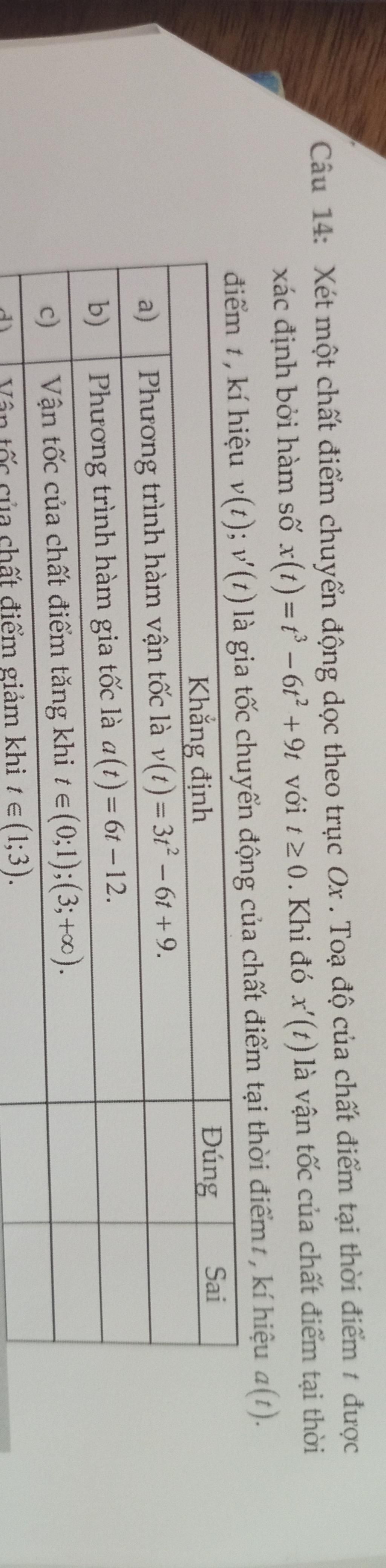 `=>` Vận tốc của chất điểm giảm khi `t in (0;2)`