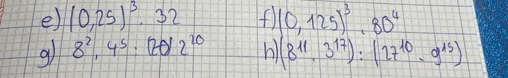 `h,` `( 8^11 . 3^17 ) : ( 17^10 . 9^15 ) = {8^11 . 3^17}/{17^10 . 9^15} = {2^33 . 3^17}/{3^30 . 3^30} = 2^33 . {3^17}/{3^60} = 2^33 . 3^{17-60} = 2^33 . 3^{-43}`