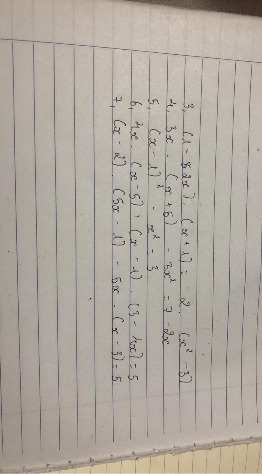 `6)` `4x(x - 5) + (x - 1)(3 - 4x) = 5`