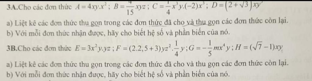 `a)` Các đơn thức thu gọn là: `B = 4/15 xyz; D = (2 + sqrt 3) xy^3`