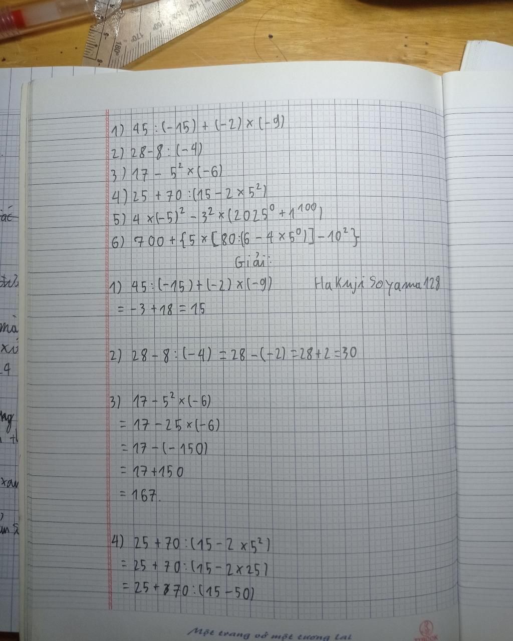 6) 700+ ngoặc nhọn 5×ngoặc vuông 80:(6-4×5^0)ngoặc vuông-10^2 ngoặc nh