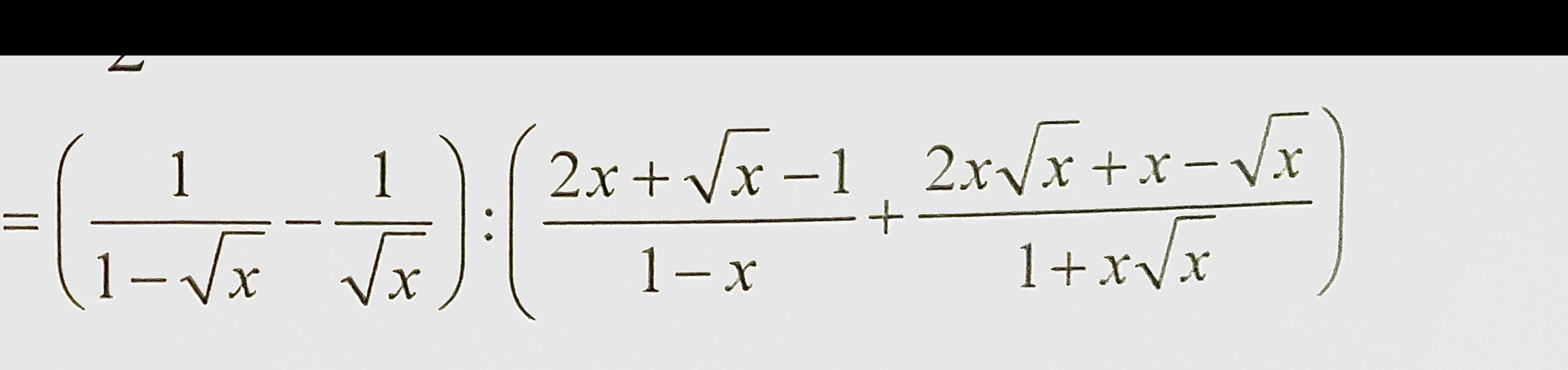 $ \left( \dfrac{1}{1 - \sqrt{x}} - \dfrac{1}{\sqrt{x}} \right) : \left( \dfrac{2x + \sqrt{x} - 1}{1 - x} + \dfrac{2x\sqrt{x} + x - \sqrt{x}}{1 + x\sqrt{x}} \right) \\ $