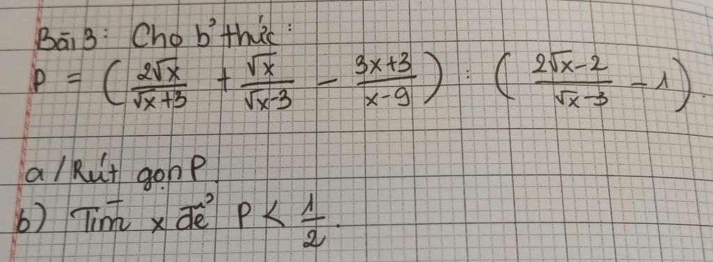 Vậy `P = (-3)/(\sqrt{x} + 3)` với `x \ge 0;x \ne 9`