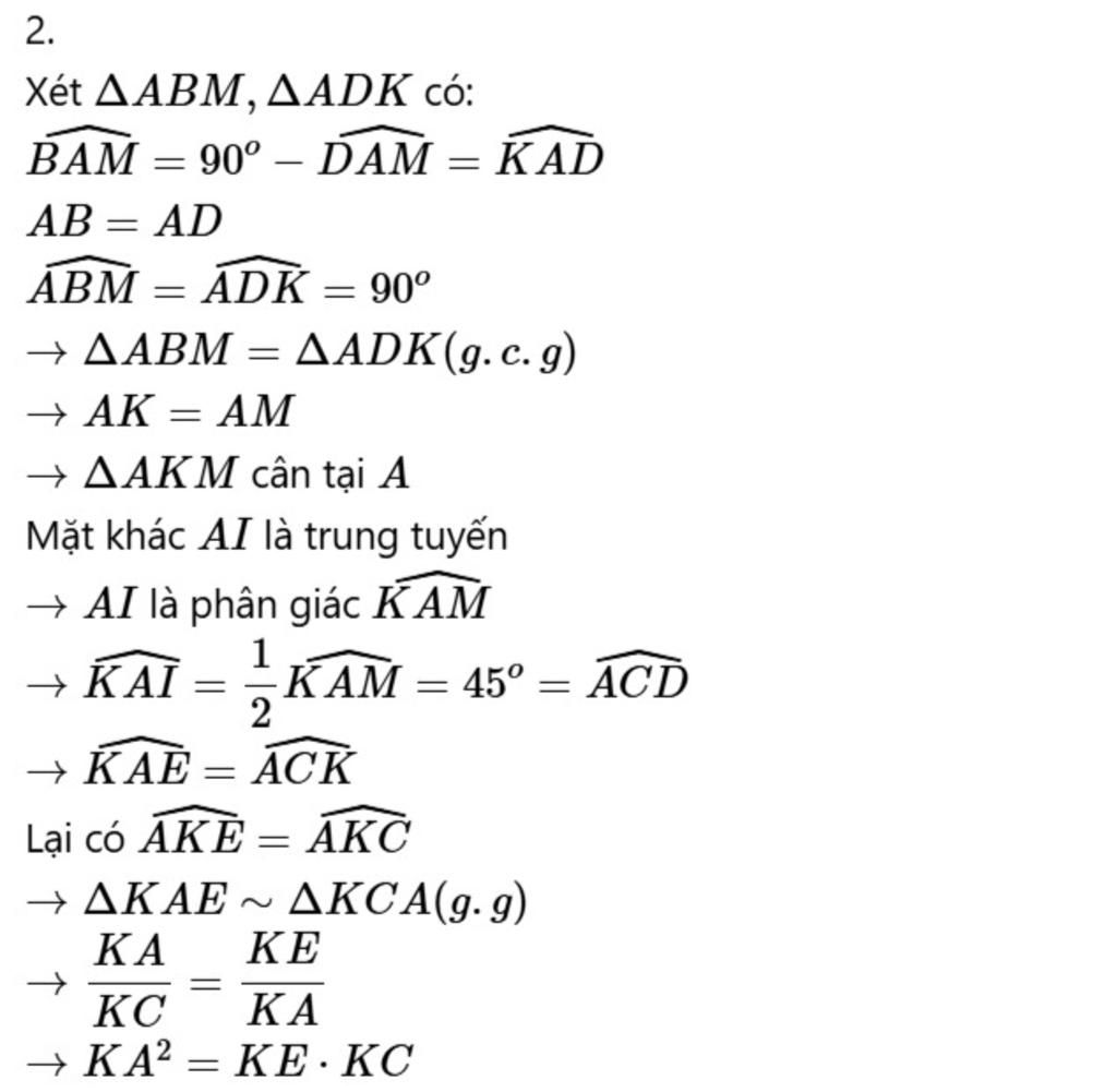 Từ hai kết quả trên, ta có: $\widehat{KAE} = \widehat{ACK} = 45^\circ$