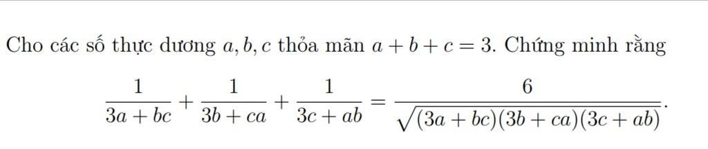 `=1/(3a+bc)+1/(3b+ca)+1/(3c+ab)6/(sqrt((3a+bc)(3b+ca)(3c+ab)))`