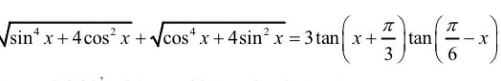 `-> \sqrt{sin^4x+4cos^2x}+\sqrt{cos^4x+4sin^2x}=3tan(x+(\pi)/(3))tan((\pi)/(6)-x) (đpcm)`