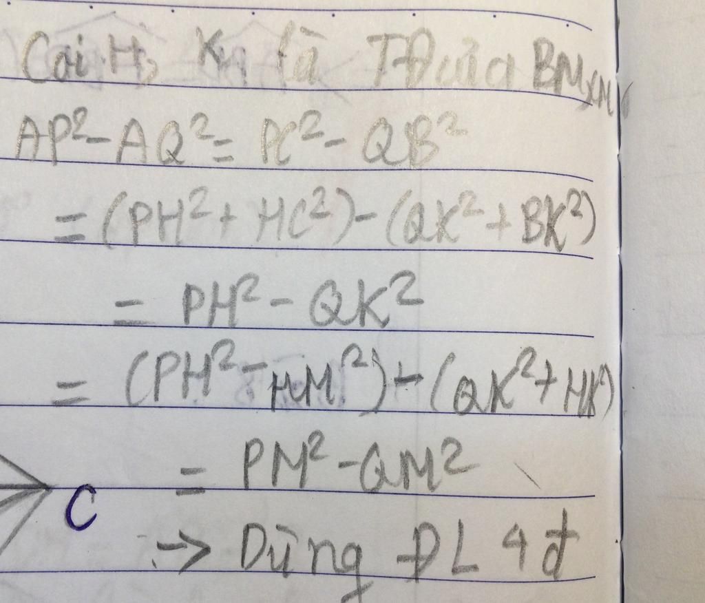 Cho tam giác ABC có H là trung điểm BC. Đường trung trực đoạn AC cắt đường trung trực đoạn BH tại P. Đường trung trực đoạn AB cắt đường trung trực đoạn CH tại Q. Chứng minh rằng AH vuông góc với PQ.(Dùng định lí 4 điểm)