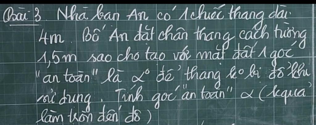 Gọi `alpha` là góc "an toàn" tạo bởi thang và mặt đất