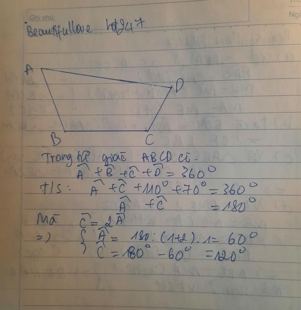 cho hình tứ giác ABCD có góc B bằng 110 độ góc D bắng 70 độ góc C = 2 lần góc A