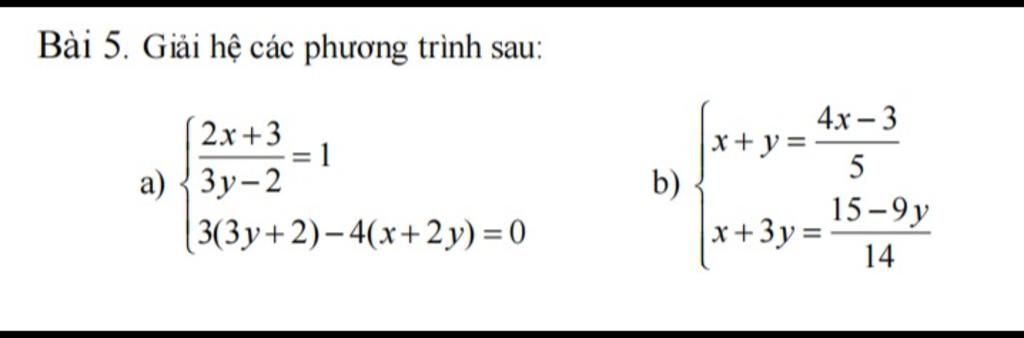$\begin{cases}\dfrac{2x+3}{ 3y-2}=1\\ 3(3y+2)-4(x+2y)=0\end{cases}$