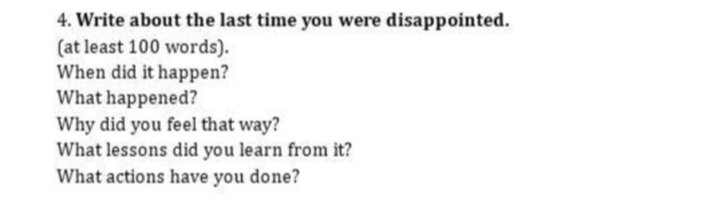 The last time I experienced a significant disappointment was approximately six months ago, in early January of this year. It revolved around a competitive internship application that I had invested a considerable amount of time and effort into. I had gone through multiple rounds of interviews, felt confident in my performance, and had a strong belief that this opportunity would be a crucial stepping stone for my career aspirations. The disappointment stemmed from receiving the rejection email.I had built up such high hopes for this specific internship, and the news hit me harder than I anticipated. The feeling of not being chosen, despite my perceived qualifications and dedication, was disheartening. I felt a sense of personal failure and questioned my abilities, leading to a period of self-doubt and frustration.However, this experience, while painful, offered valuable lessons. I learned the importance of resilience in the face of setbacks and the need to not tie my self-worth solely to external validation or outcomes. It also taught me to diversify my opportunities and not put all my eggs in one basket. I realized that while preparation is key, not every outcome is within my control, and that accepting this reality is crucial for moving forward. Following this disappointment, I took several actions. Firstly, I allowed myself time to process the emotions, but then actively shifted my focus towards improving my application materials and seeking feedback on my interview skills. I also expanded my search to a wider range of companies and industries, exploring new possibilities I hadn't considered before. Finally, I committed to a personal project to enhance my skills, turning the setback into an opportunity for growth and development.