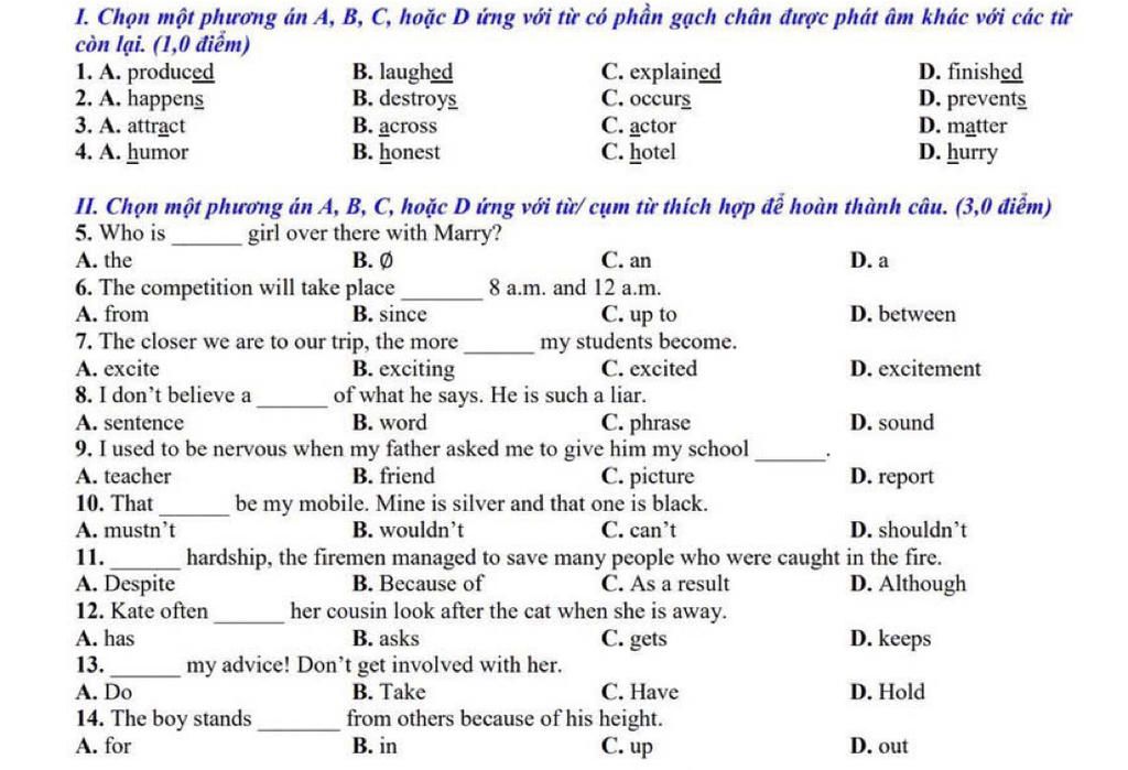 `1.C` đuôi /d/ còn lại đuôi /t/ `2.D` đuôi /s/ còn lại đuôi /z/ `3.B` /ə/ còn lại /æ/ `4.B` chữ "h" bị câm