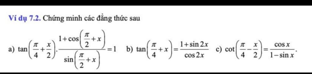 $VT = \tan\left(\dfrac{\pi}{4}+x\right) = \dfrac{\tan\left(\dfrac{\pi}{4}\right) + \tan x}{1 - \tan\left(\dfrac{\pi}{4}\right)\tan x} = \dfrac{1 + \tan x}{1 - \tan x} (đpcm)$.
