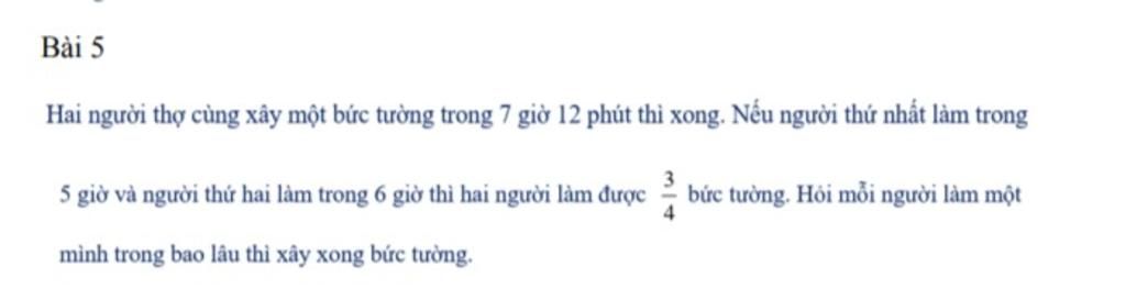 Gọi thời gian hoàn thành công việc khi làm riêng của người thứ $I, II$ lần lượt là $x,y$ giờ, $(x,y>0)$