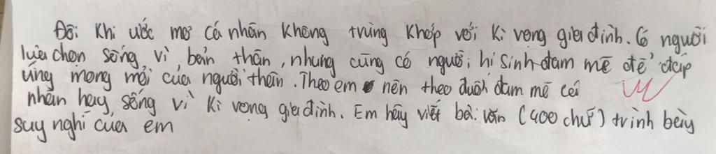 Vậy nên, em tin rằng điều quan trọng không phải là hoàn toàn sống vì ai, mà là làm sao để sống mà không tự phản bội chính mình, cũng không phụ lòng những người đã dày công dưỡng dục. Theo đuổi đam mê là một hành trình đẹp, nhưng nếu có thể, hãy để đam mê đó nở hoa trong sự đồng thuận của yêu thương, trong ánh nhìn tự hào của những người thân yêu nhất. Chỉ khi đó, ta mới có thể sống một đời vừa đủ sâu, vừa đủ rộng, vừa đủ đầy ý nghĩa.