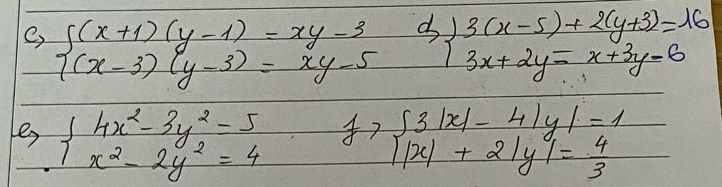 `{( (x+1)(y-1) = xy - 3 ),( (x-3)(y-3) = xy - 5 ):}`