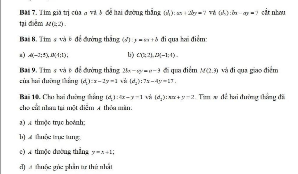 Bài 7. Tìm giá trị của a và b để hai đường thẳng (dị): ax+2by=7 và (d)):bx-ay=7 cắt nhau