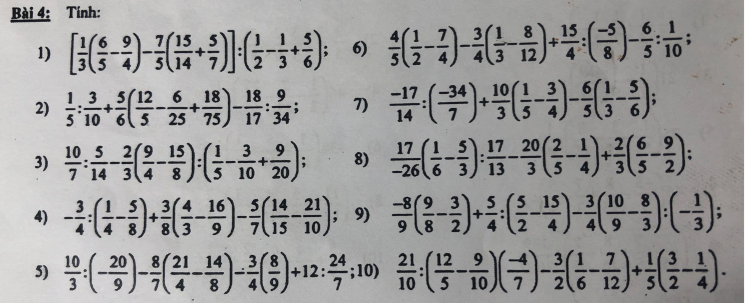 6) `4/5(1/2-7/4)-3/4(1/3-8/12)+15/4:(-5/8)-6/5:1/10`