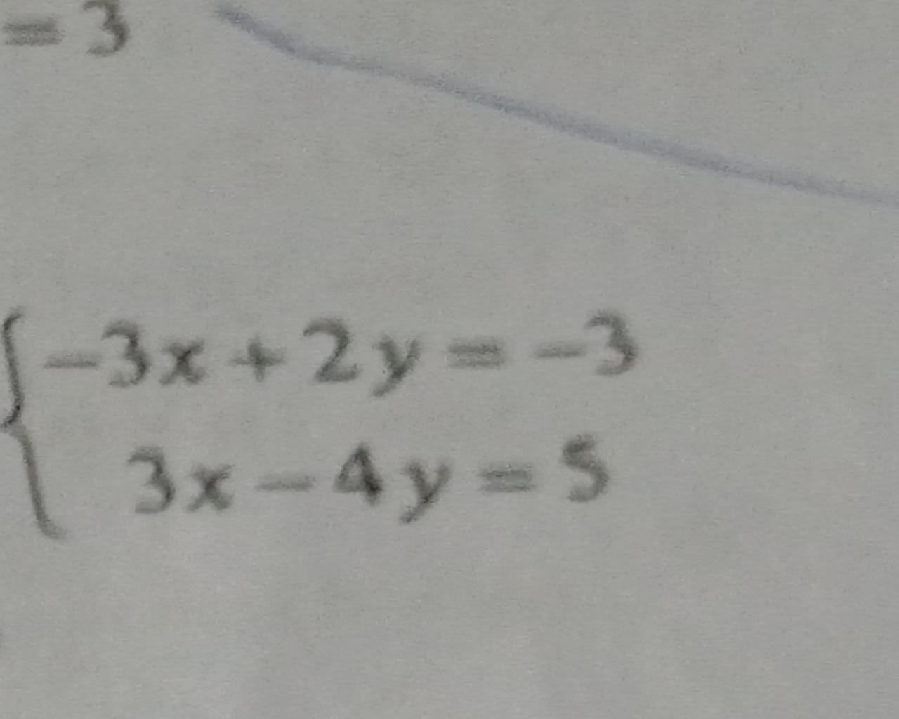 `{(-3x + 2y = -3),(3x - 4y = 5):}`