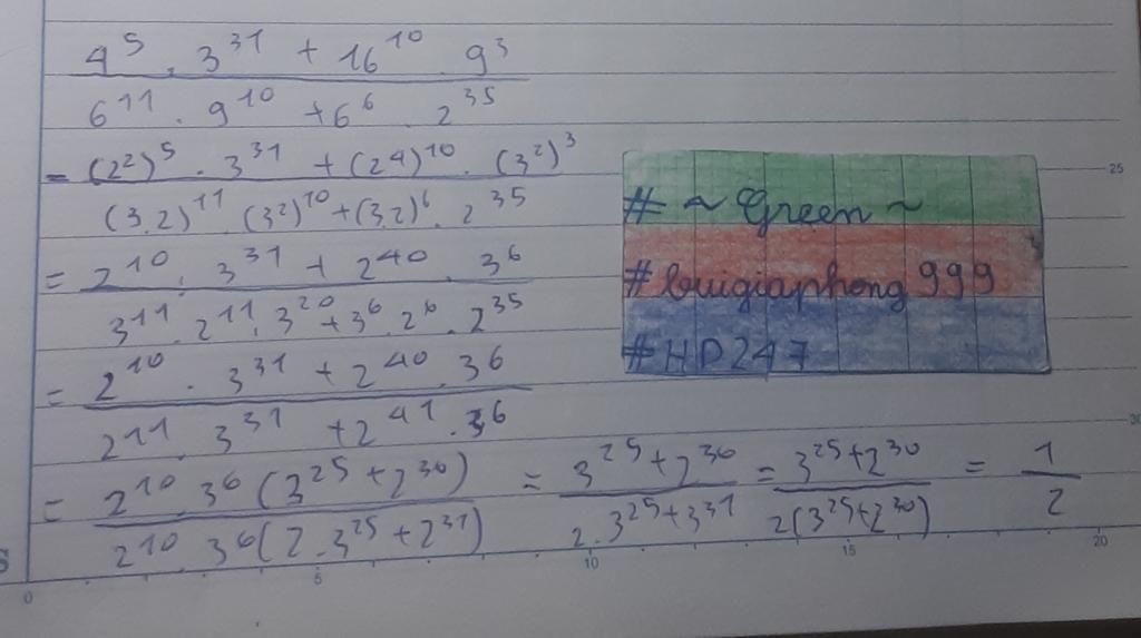 `=( (2^2)^5 . 3^31 + (2^4)^10 . (3^2)^3 )/( (2 . 3)^11 . (3^2)^10 + (2.3)^6 . 2^35) `
