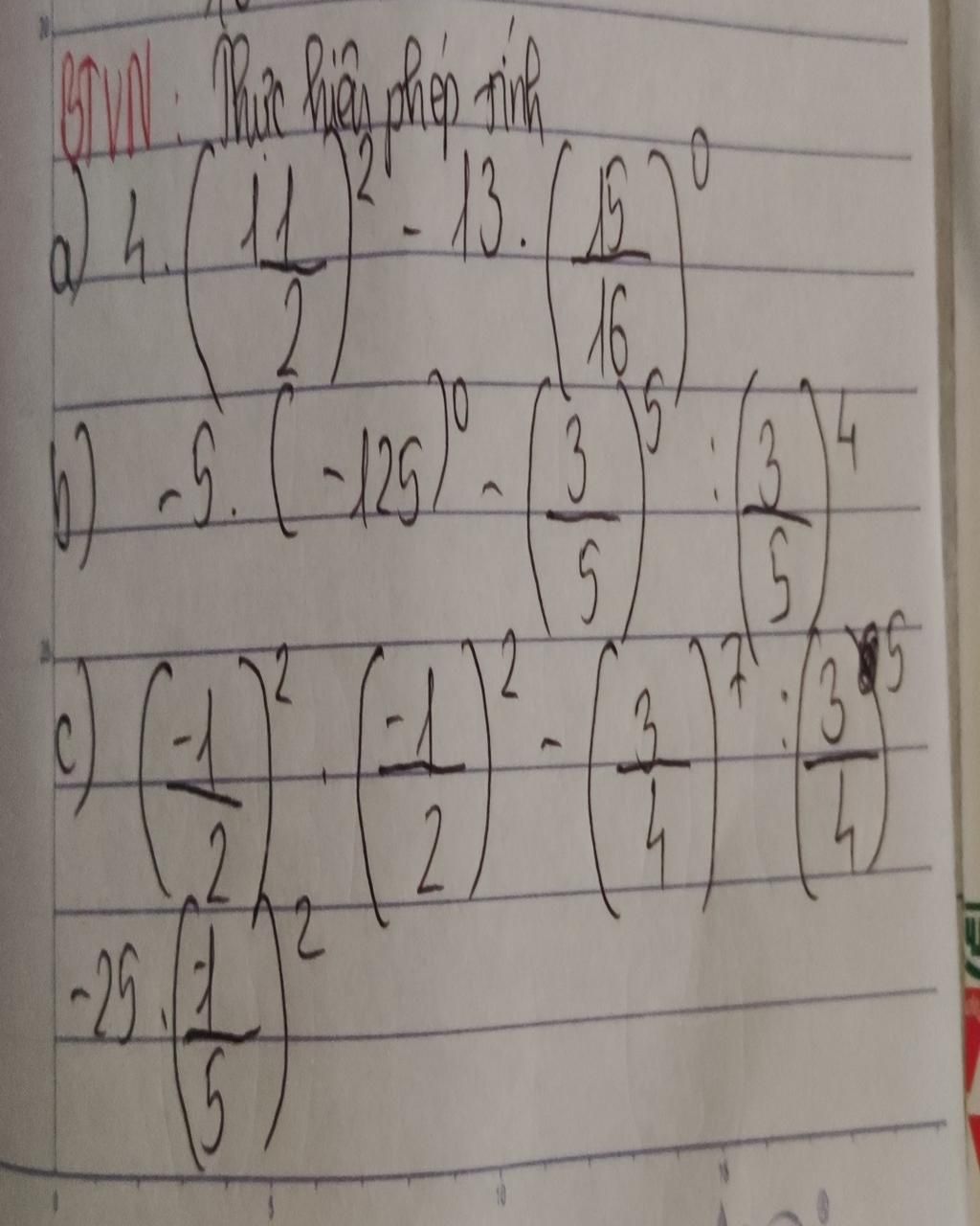 `(-1/2)^2 . (-1/2)^2 - (3/4)^7 : (3/4)^5 - 25 . (-1/5)^2`