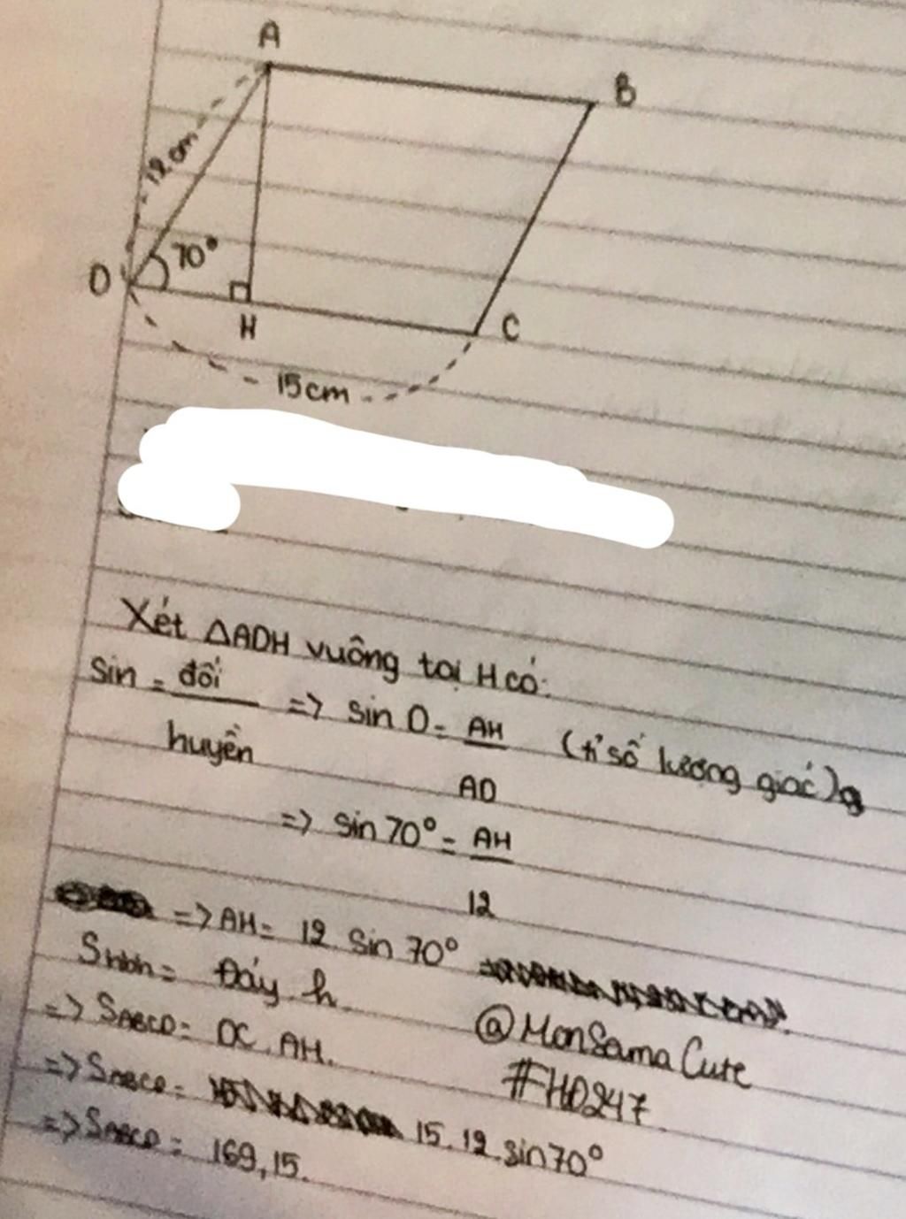 tính diện tích hình bình hành ABCD biết AD = 12cm, DC = 15cm, ADC = 70 độ