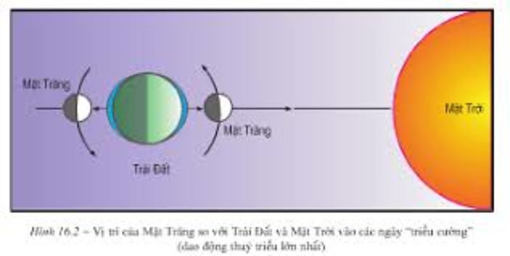 + Triều cường: Khi Mặt Trăng, Trái Đất và Mặt Trời ở vị trí thẳng hàng, lực hút của Mặt Trăng (chủ yếu) kết hợp với lực hấp dẫn của Mặt Trời (một phần nhỏ) khiến lực hấp dẫn tới Trái Đất lớn nhất => lúc này nước triều dâng lên cao nhất.