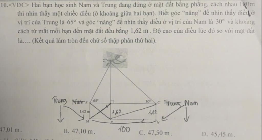 Theo giả thiết đề bài, Trung đứng ở vị trí $M$, Nam đứng ở vị trí $N$, $AC = MN = 100(m)$ và độ cao của diều so với mặt đất là $BP$