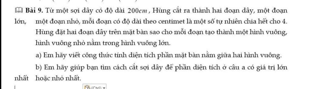 $\to$Cắt đoạn dây thành $2$ đoạn $104$ cm, $96$ cm để được diện tích nhỏ nhất