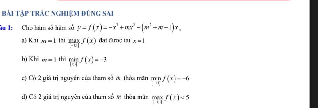 `b)` Khi `m = 1 to min_{[-1;1]} f(x) = f(1) = -1^3 + 1^2 - 3 . 1 = -3`