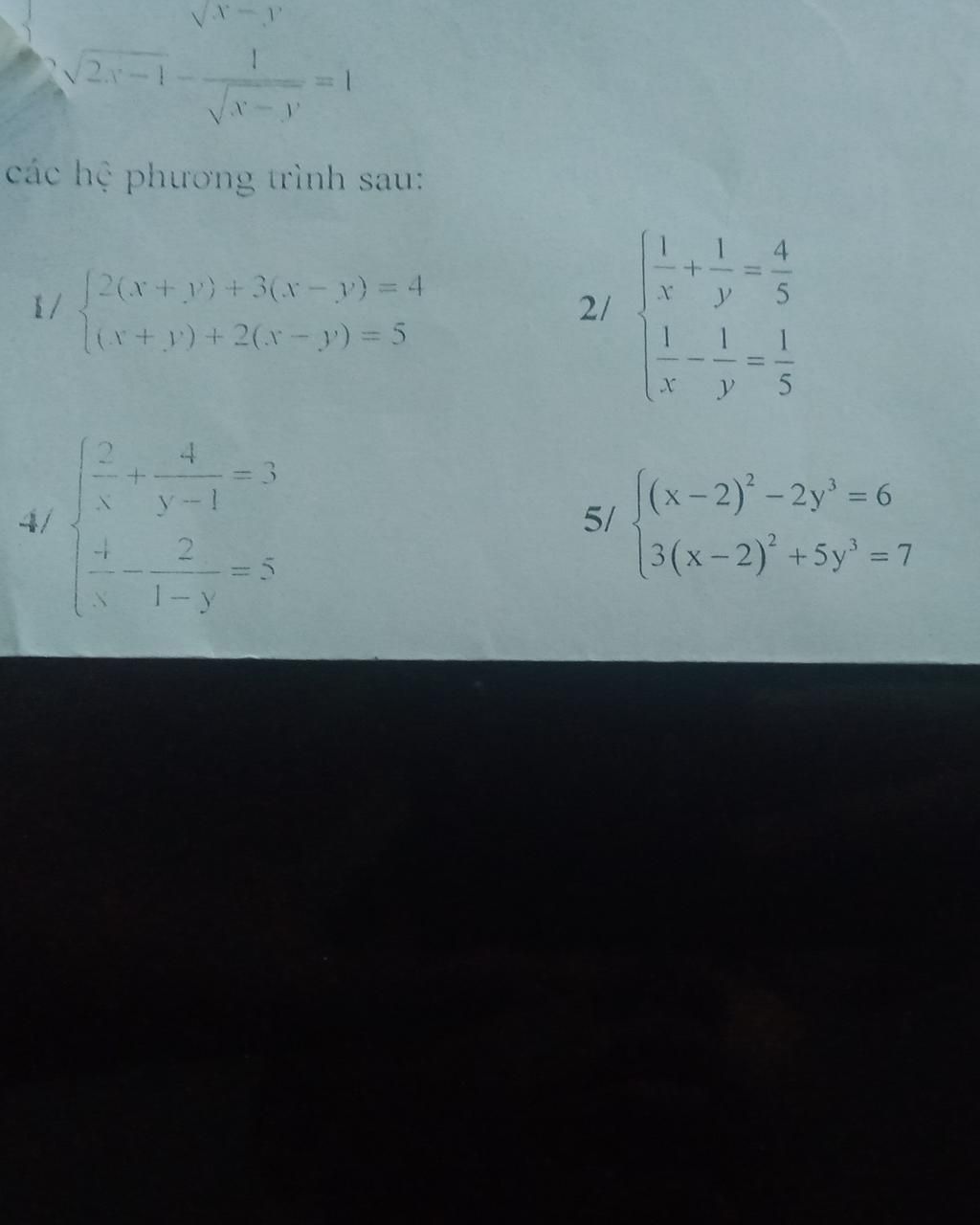 `4){(2/x+4/(y-1)=3),(4/x-2/(1-y)=5):}` (ĐK: `x\ne0,y\ne1)`