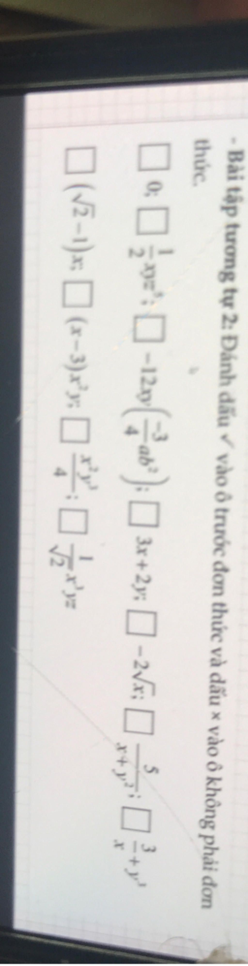`0 , 1,2x^2 , -12xy(-3/4ab^2), -2\sqrtx , (\sqrt2-1)x , (x^2y^3)/4 , 1/\sqrt2 xy^3`