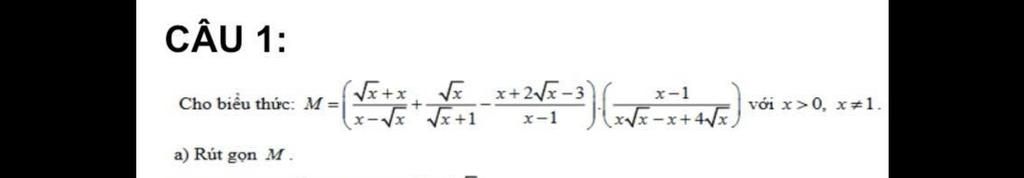`M = [(1 + sqrt{x})/(sqrt{x} - 1) + sqrt{x}/(sqrt{x} + 1) - (x + 2sqrt{x} - 3)/((sqrt{x} - 1)(sqrt{x} + 1)) . (x - 1)/(sqrt{x} . (x - sqrt{x} + 4))`
