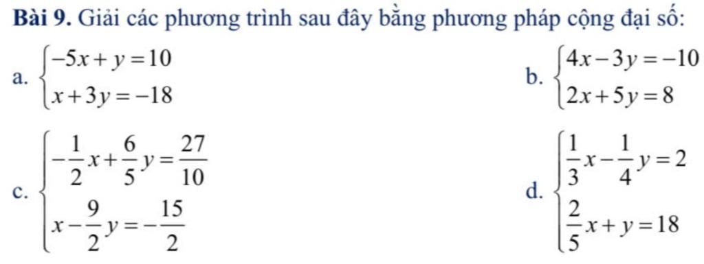 `d.` $\begin{cases} \frac{1}{3}x - \frac{1}{4}y = 2 \\ \frac{2}{5}x + y = 18 \end{cases}$