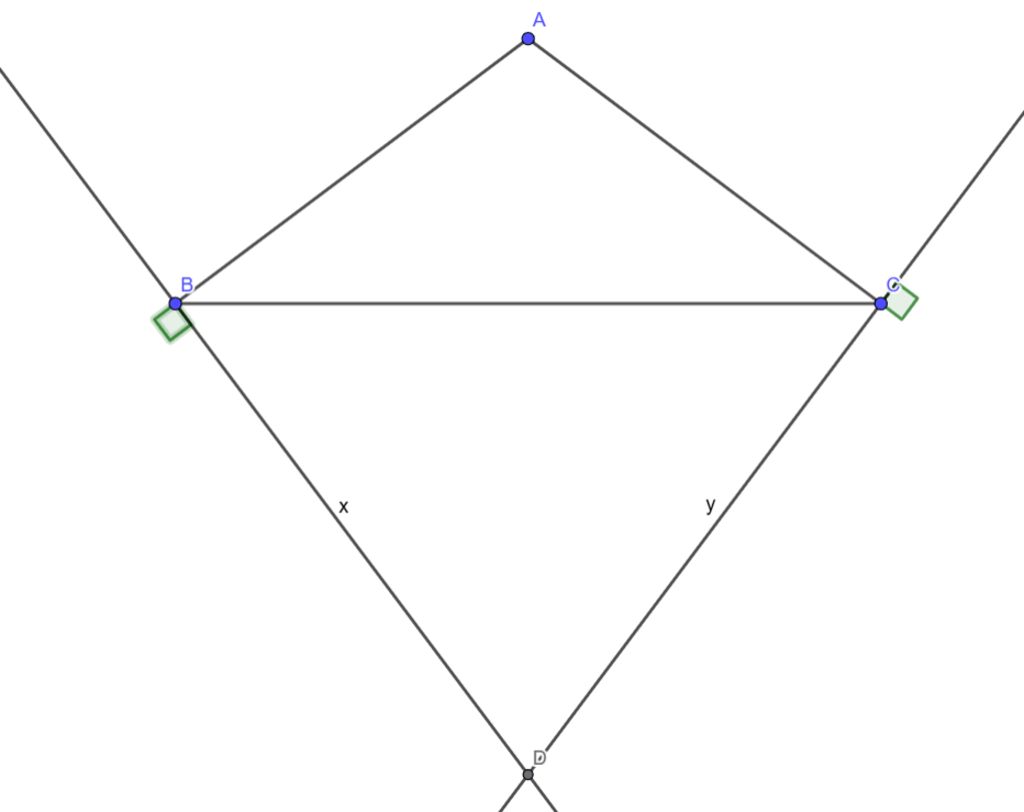 Cho ABC có AB = AC . Trên nửa mặt phẳng bờ BC ko chứa điểm A , vẽ tia Bx , Cy sao cho Bx vuông góc BA và Cy vuông góc CA . gọi D là giáo điểm của Bx và Cy