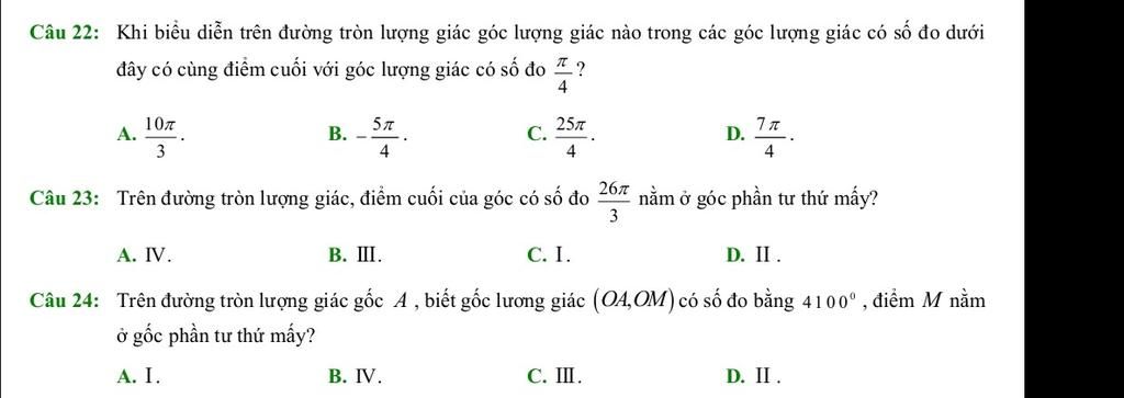 Trong các đáp án bài cho ta thấy `(25\pi)/(4)=(\pi)/(4)+3.2\pi`