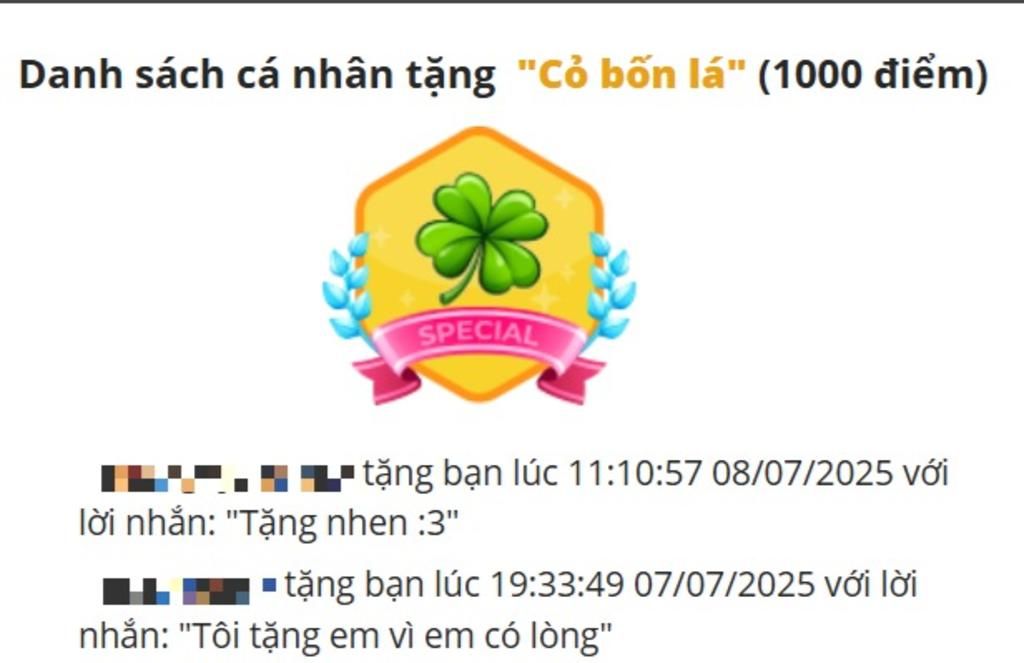 Danh sách cá nhân tặng "Cỏ bốn lá" (1000 điểm)
