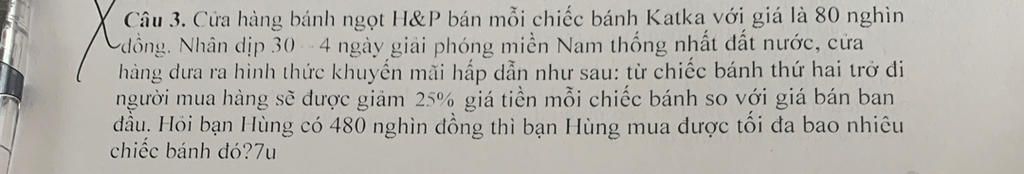 Gọi $x$ là số chiếc bánh bạn Hùng mua được ($x \in \mathbb{N}^*$)
