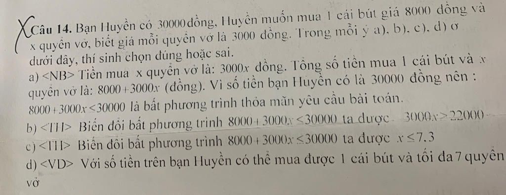 Bất phương trình biểu thị số tiền mua bút và vở không vượt quá số tiền bạn Huyền có là: