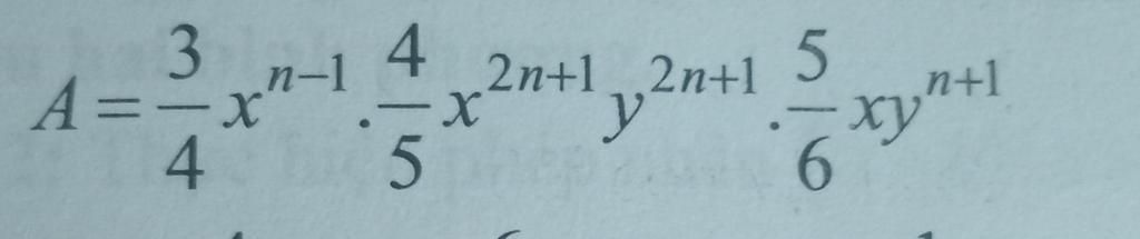 `A=3/4x^(n-1)*4/5x^(2n+1)y^(2n+1)*5/6xy^(n+1)`