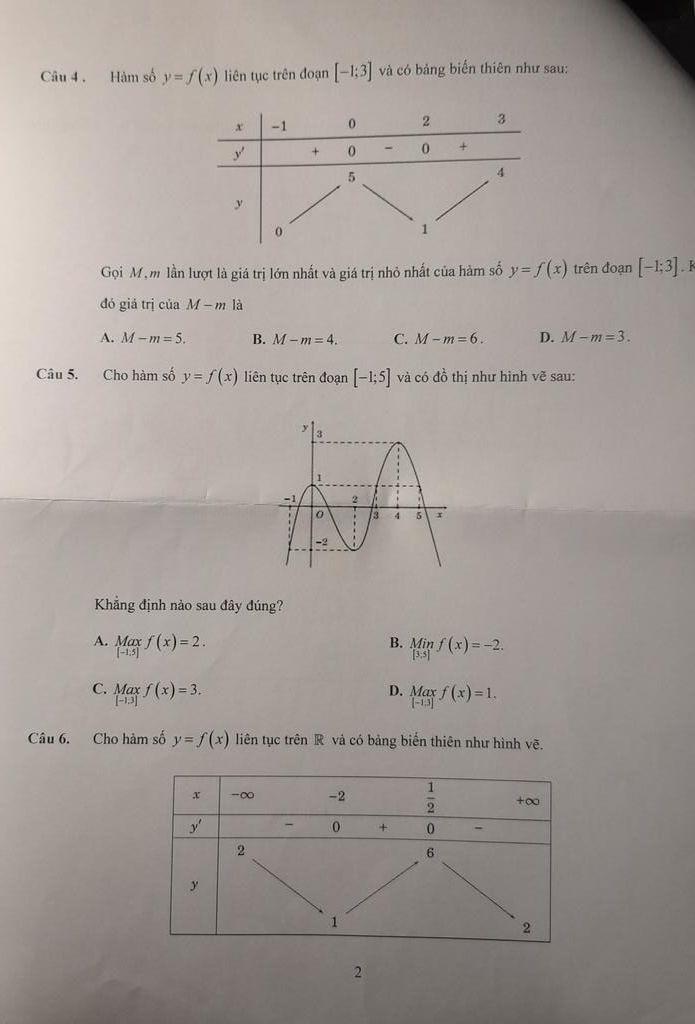 `A. max_{[-1;5]} f(x)=2`. Nhận thấy trên đoạn `[-1;5]`, `f(x)` đạt giá trị lớn nhất là `3` tại `x=4`