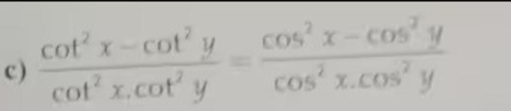 `=((cos^2 x)/(sin^2 x)-(cos^2 y)/(sin^2 y))/((cos^2 x)/(sin^2 x).(cos^2 y)/(sin^2 y))`