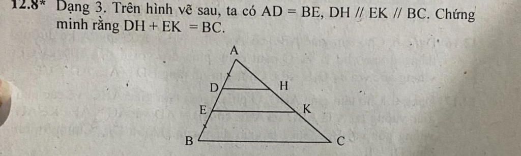 `Mà AD = BE => ( BE + AE )/( AB ) = ( DH + EK )/( BC )`