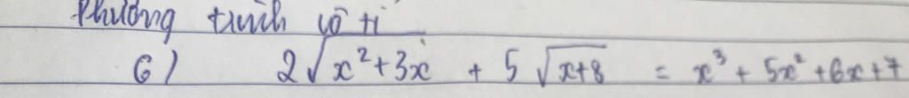 `=>` `2*(x^2+3x-4)/(sqrt(x^2+3x)+2)+5*(x+8-9)/(sqrt(x+8)+3)=(x-1)(x^2+6x+12)`
