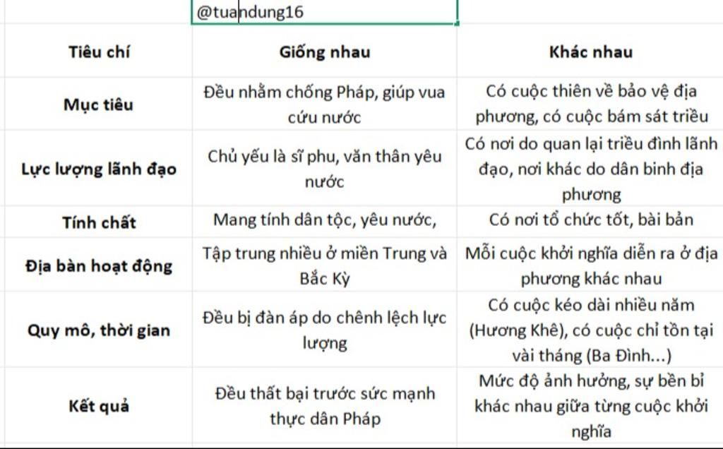 \begin{array}{|c|c|c|}\hline \text{STT}&\text{Giống nhau}&\text{Khác nhau}\\\hline \text{1}&\text{Tất cả các khởi nghĩa đều nhằm chống thực dân Pháp, bảo vệ độc lập dân tộc}&\text{Mỗi khởi nghĩa có lãnh đạo riêng (Nguyễn Thiện Thuật, Văn Thân, ...)}\\\hline \text{2}&\text{Thể hiện lòng yêu nước mãnh liệt, khát khao tự do}&\text{Phương thức kháng chiến và chiến thuật khác nhau, từ du kích đến chiến tranh quy ước}\\\hline \text{3}&\text{Diễn ra trong giai đoạn cuối thế kỷ 19, trong bối cảnh bị áp bức}&\text{Các cuộc khởi nghĩa diễn ra ở các địa bàn khác nhau (Bắc, Trung, Nam)}\\\hline \text{4}&\text{ Có sự tham gia của nhiều tầng lớp xã hội, từ nho sĩ đến nông dân}&\text{Mức độ thành công và ảnh hưởng của từng khởi nghĩa cũng khác nhau}\\\hline\end{array}