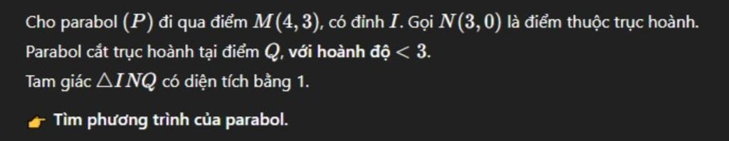 Cho parabol (P) đi qua điểm M(4,3), có đỉnh I. Gọi N(3, 0) là điểm thuộc trục hoành.