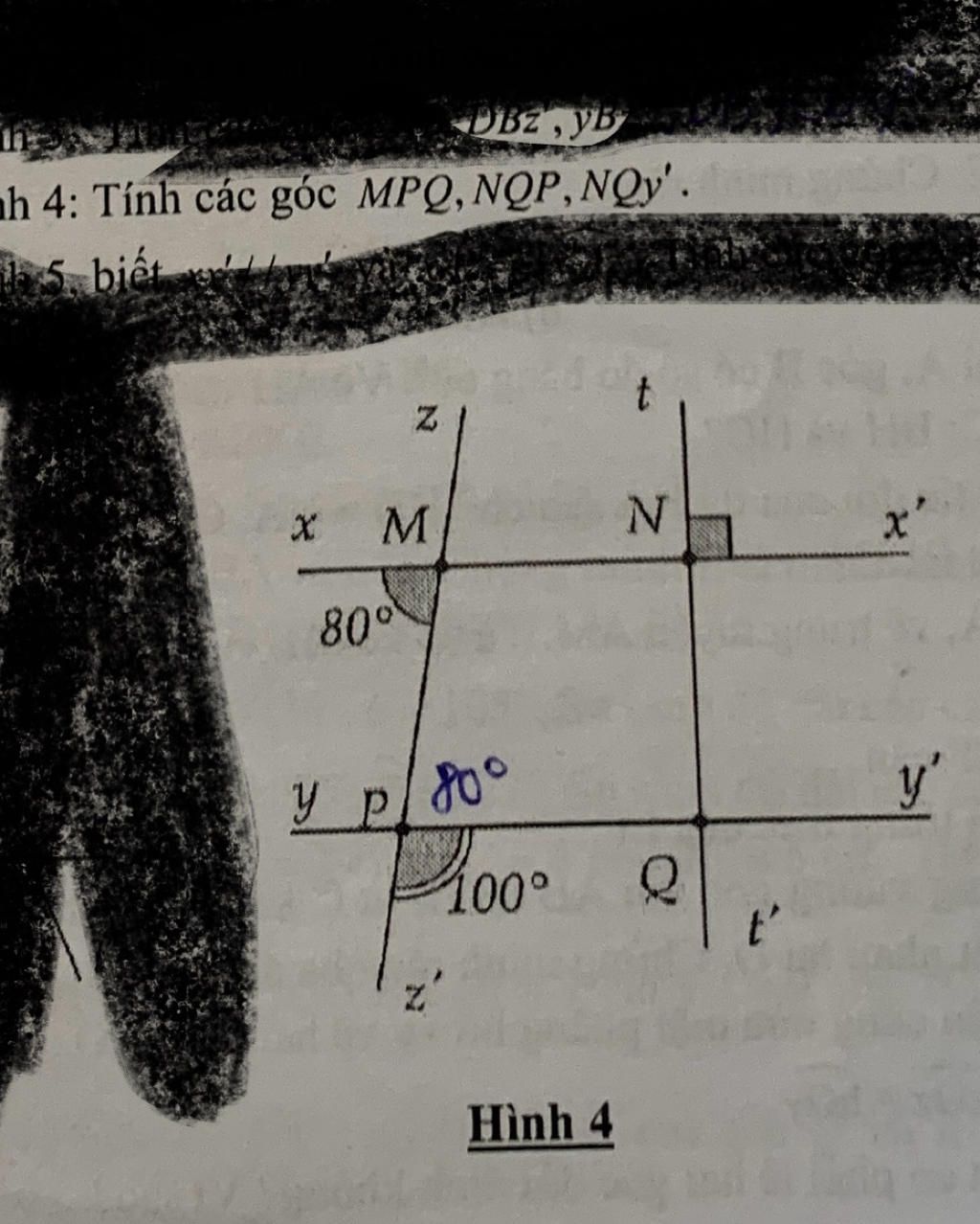 `=> \hat( MPQ) = 180^o - \hat(QPz') = 180^o - 100^o = 80^o`